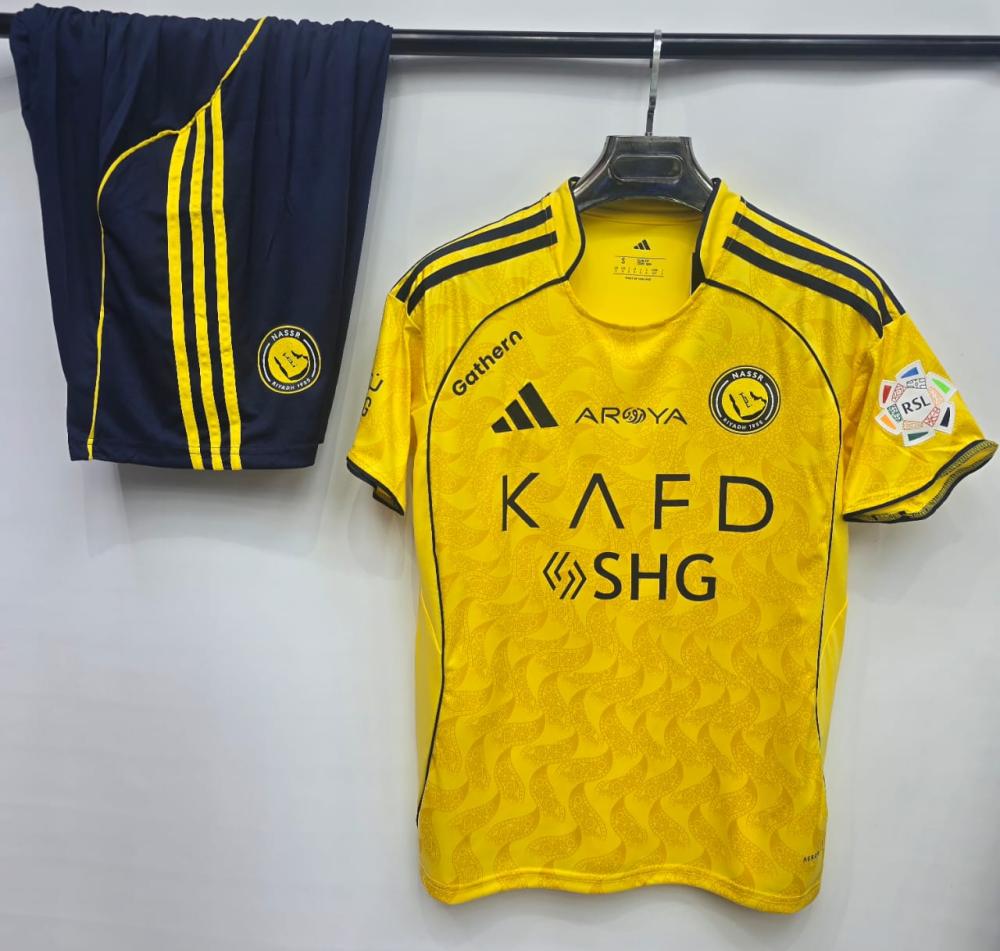 - ألوان الطقم الأصفر الزاهي تمثل هوية النصر الرسمية بأناقة واضحة.